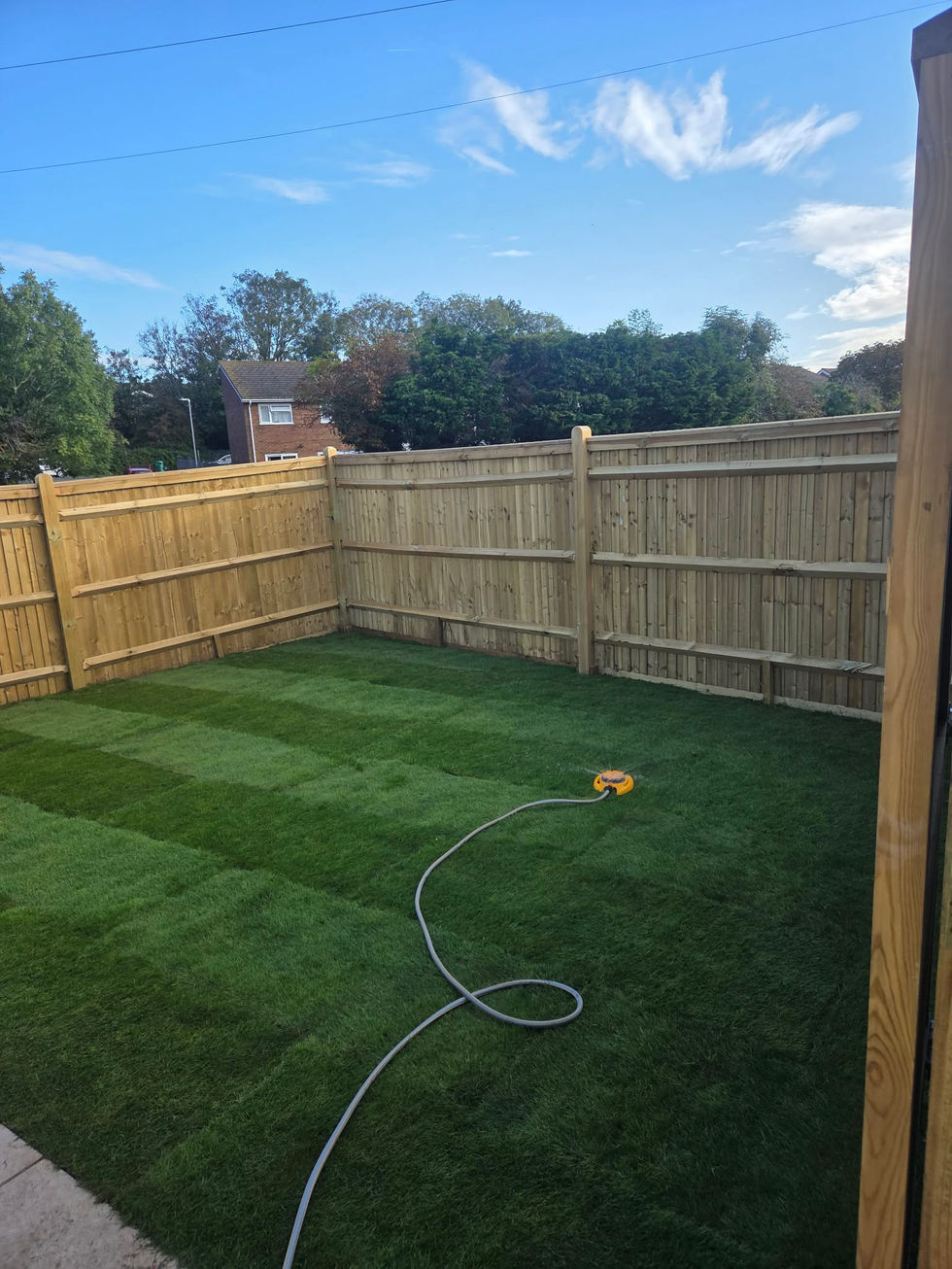 This project showcases the construction of circular stone patios in garden settings, including images of freshly laid turf with wooden fencing and patio, circular stone patio under construction in a garden, and stone patio under construction in a garden setting.