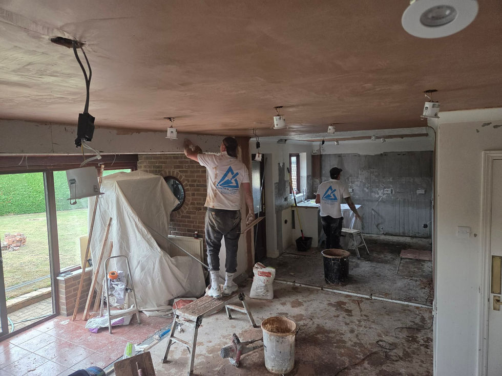 This project features the renovation of interior spaces, including freshly plastered walls, ornate fireplace, and workers plastering and renovating an interior space.